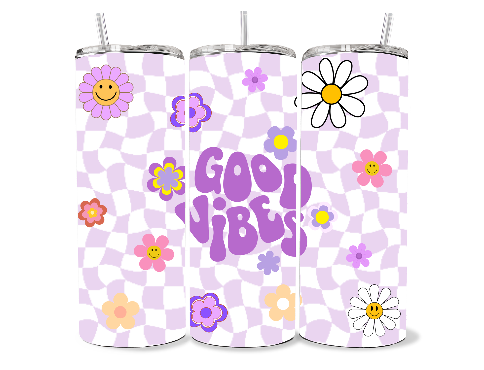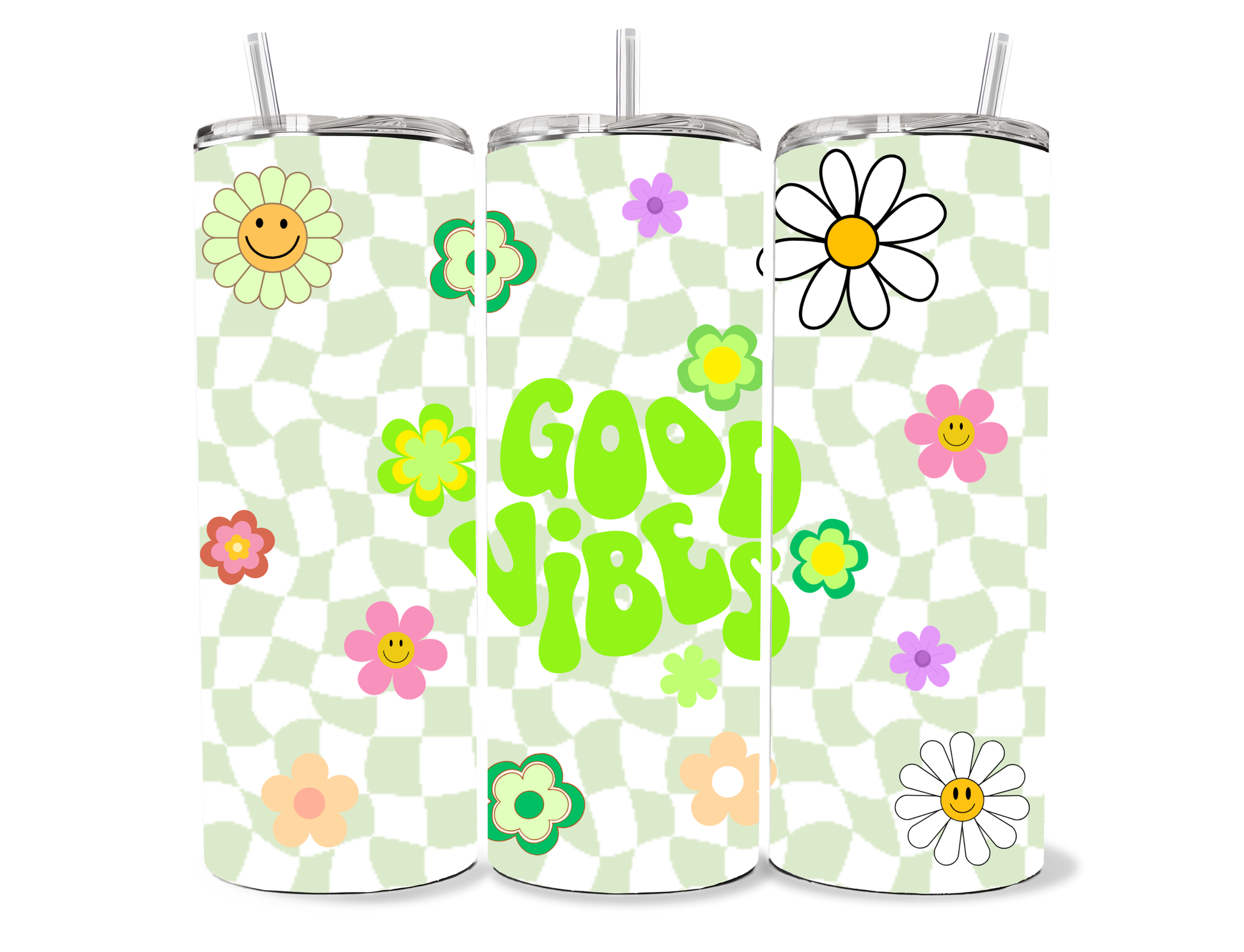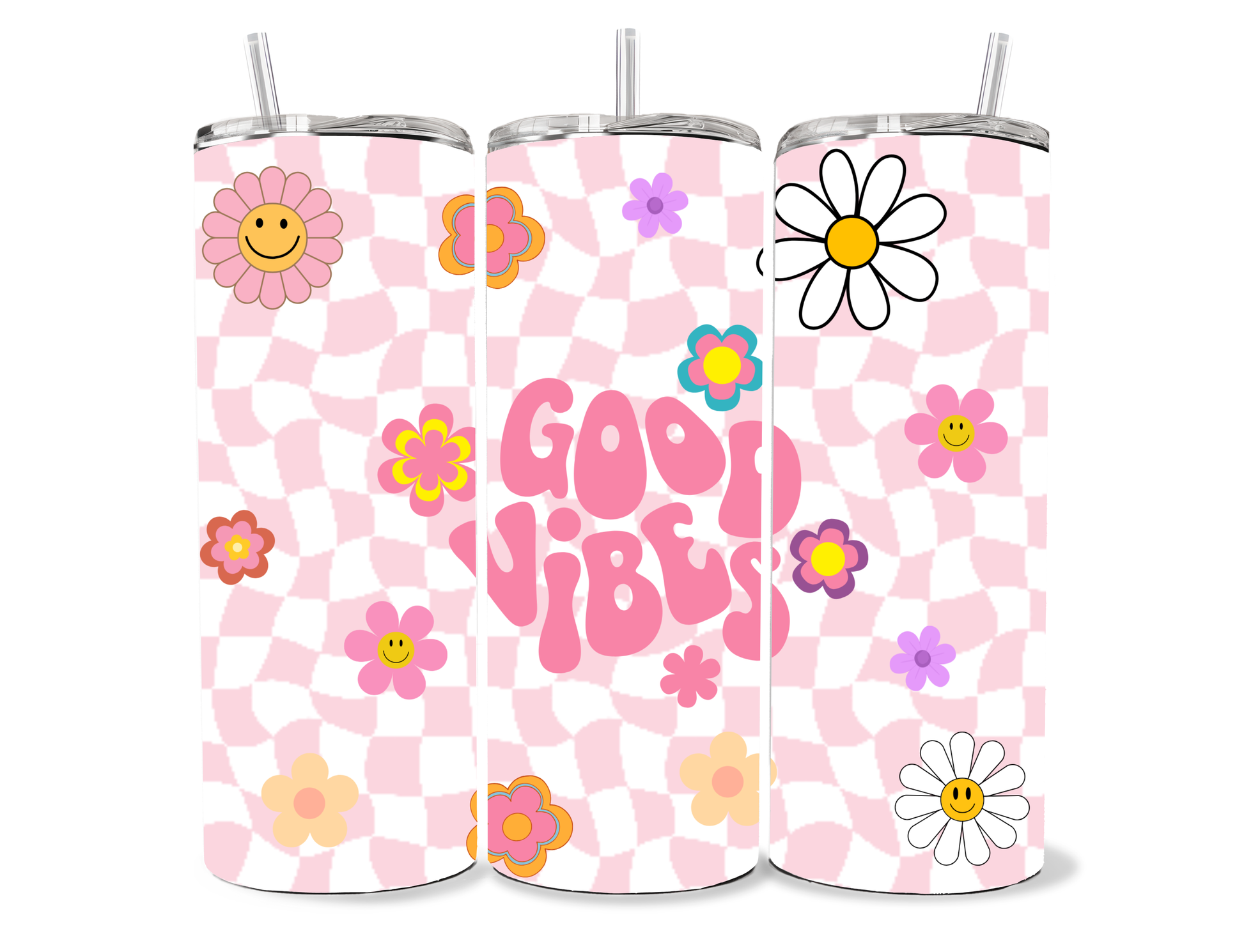 Our Good Vibes tumbler features a playful retro checkerboard background paired with happy floral illustrations and bold 70s-inspired lettering. Designed to bring instant joy, this feel-good cup is all about colour, positivity, and fun.